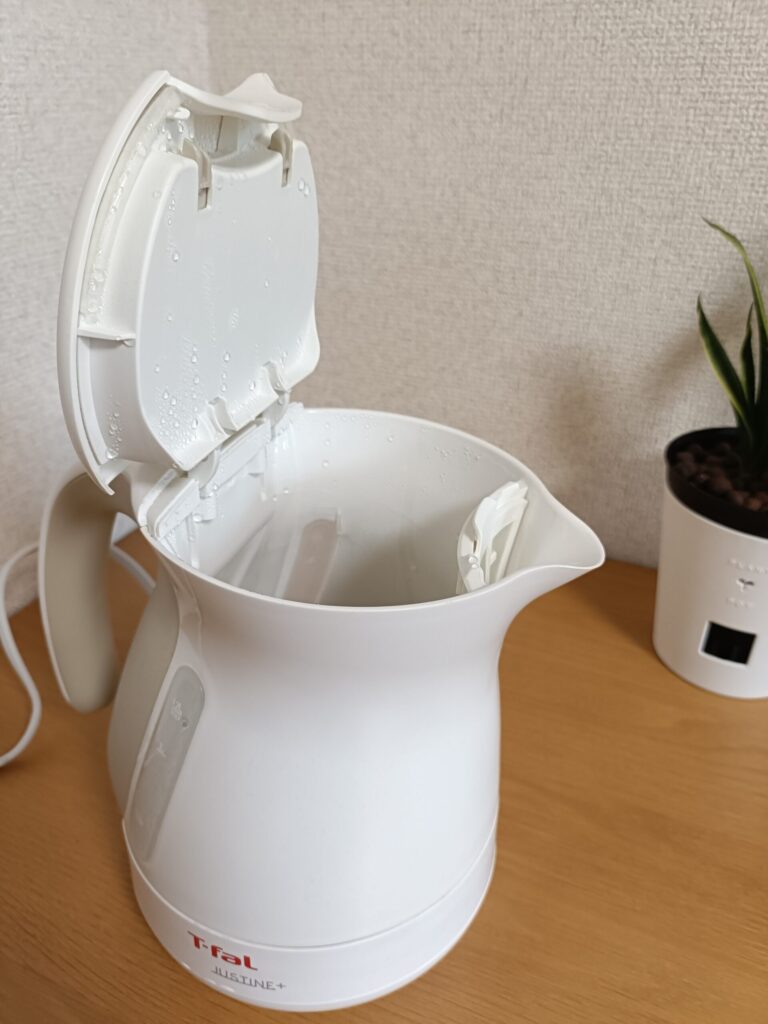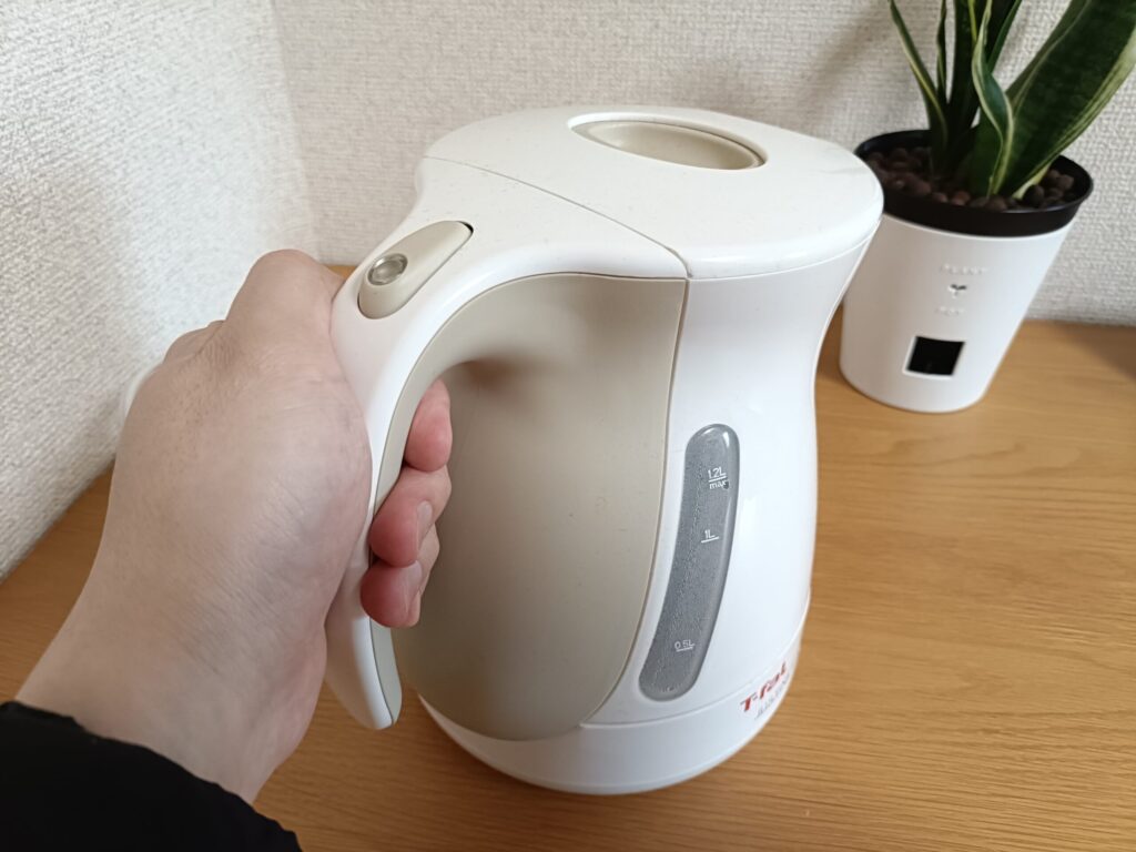 「二重構造」などの機能はないため、沸騰直後はプラスチックの本体がかなり熱くなります。 取っ手を持てば問題ありませんが、うっかり本体に触れると「あつっ!」となるので、小さなお子さんがいる家庭は置き場所に注意が必要です。