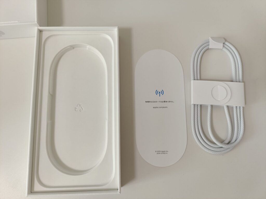 さっそく開封していきます。 iPhone 17の最大の特徴の一つが、「物理SIMスロットの廃止(eSIM専用)」です。