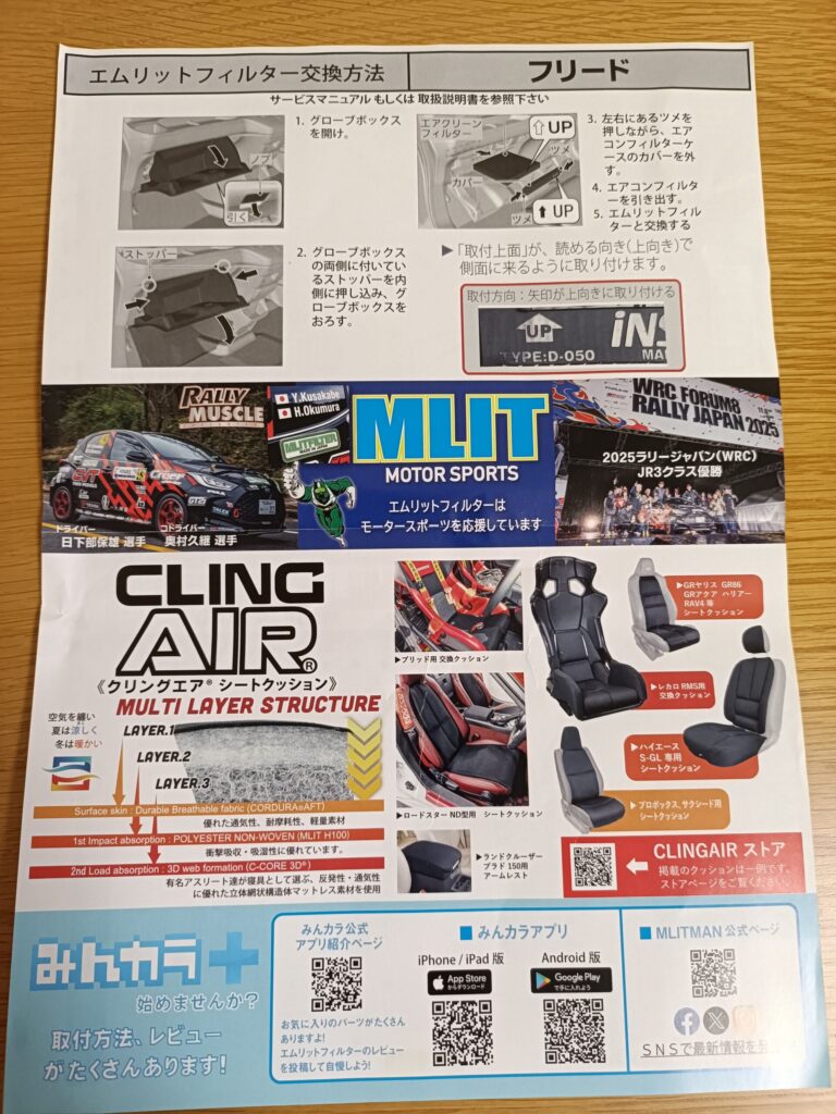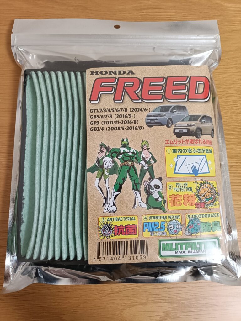 エアコンフィルターの D-050_FREED は、日本製で花粉やPM2.5を吸着してくれるとのこと。