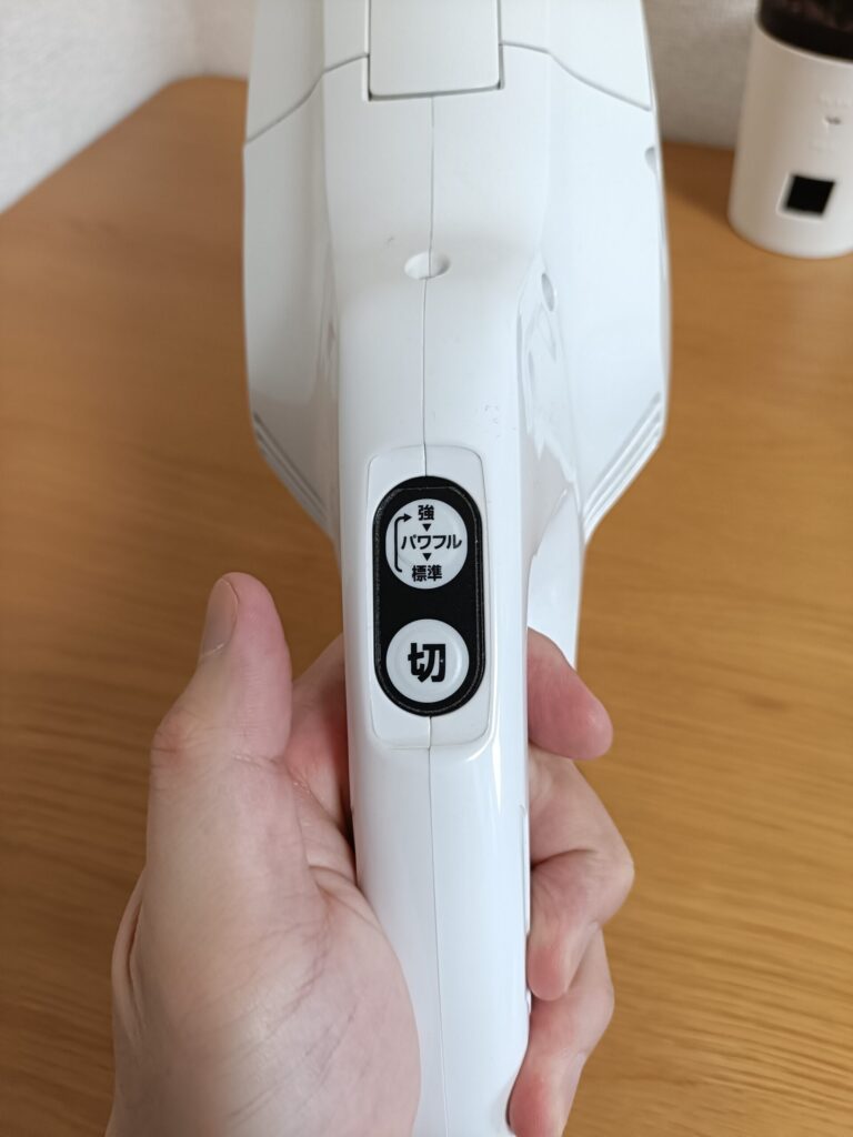 「強・パワフル・標準」の切り替えも直感的にできます。 また、地味に助かるのが、先端についているLEDライト。家具の隙間や、薄暗い車内を掃除する時にゴミがよく見えて便利なんです。
